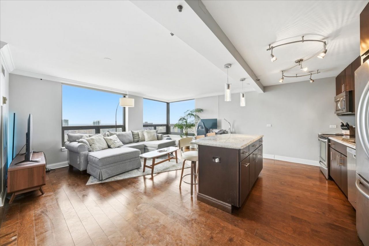 Stunning high-floor condo in the best tier of the building, just below the top floor, featuring breathtaking unobstructed sunset and city views. West-facing exposure delivers incredible sunsets, with additional north and east views through oversized windows that fill the open layout with natural light.Beautifully remodeled open-concept kitchen with flat-front wood cabinetry, soft-close drawers, stone countertops, KitchenAid appliances, electric stove and a large 4' x 6' island. Hardwood floors throughout, 3 large closets with custom closet systems, remodeled bath, contemporary doors and hardware, custom shades, and updated lighting. Full-amenity luxury building with 24/7 door staff, fitness center, indoor pool, sauna, sundeck, party room, theater room, business center, and more. Prime location in River North just steps to Michigan Avenue and the Chicago Riverwalk - world-class dining, shopping, and entertainment all within walking distance. Laundry in common area. Garage parking available for $200/month & DOES NOT have to be rented with unit. Available now.