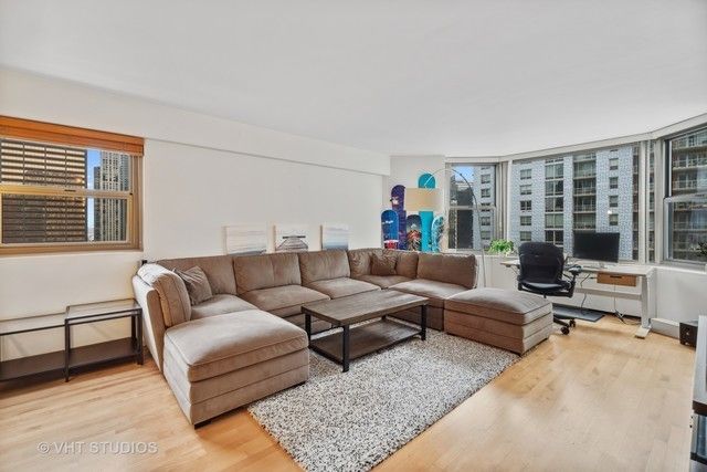 Bright & spacious Magnificent Mile southeast corner one bedroom with streaming sunlight, city and lake views. Open kitchen with maple cabinets with crown molding, granite countertops, stainless steel appliances, breakfast bar with pendant lights, touch-free faucet, and extra window. Generously sized living room and bedroom with bay windows & hardwood floors. Bedroom features professionally organized closets and blackout shades. Brand new A/C unit in living room. Remodeled bathroom with maple vanity, marble countertop, whirlpool tub, ceramic tile floor and shower surround. Full amenity building features indoor pool & hot tub, state of the art fitness center, party room, roof top sundeck that wraps around the entire building for full 360-degree views, 24-hour door staff, receiving room, storage lockers, dry cleaners, laundry room & bike room. Heat, A/C, water, basic cable, and internet included in assessments! Valet parking available for rent. Amazing Magnificent Mile location is close to Michigan Ave. shopping, restaurants, Lake Michigan, Navy Pier, Lake Shore Dr, public transportation, Whole Foods, Trader Joes, Target, Eataly, and 3 blocks from Northwestern Memorial Hospital. Available June 1st. Showings begin on April 1st. No pets allowed.