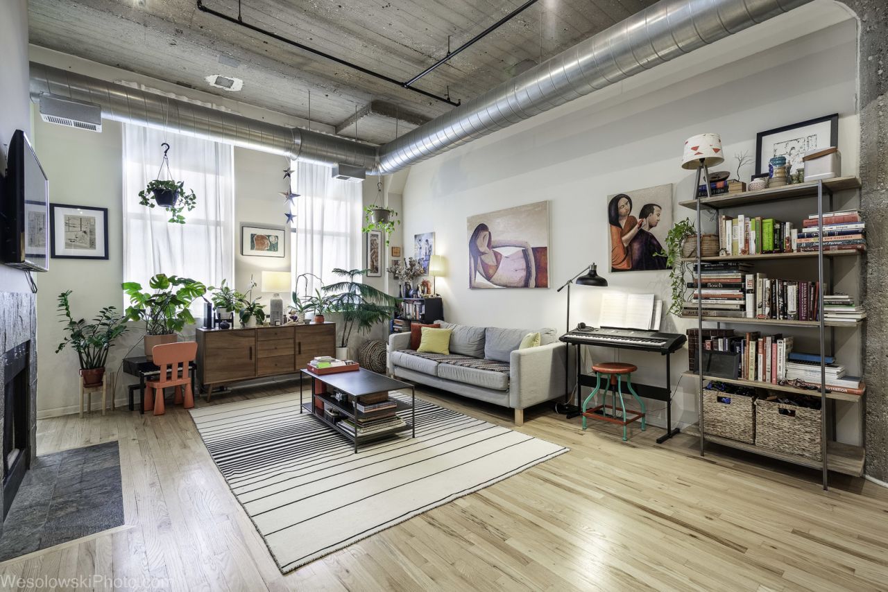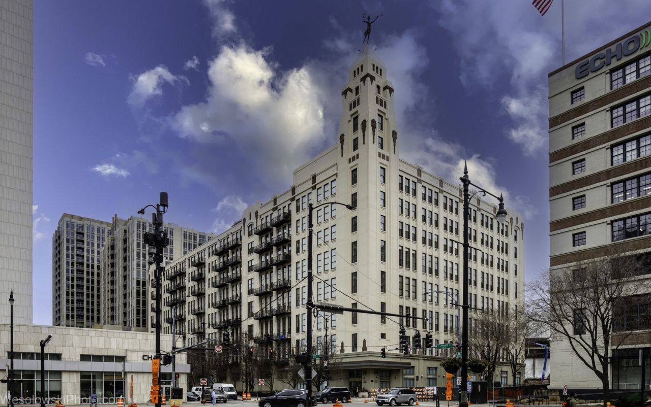 AVAILABLE JUNE 22, 2026: Wonderful loft condo in iconic River North building, the former Montgomery Ward administration building. Enjoy sunset views from the private balcony overlooking the Chicago River and easy access to the area's art galleries, dining, shopping and nightlife from this quiet perch. Unit features an open floorplan with 12' ceilings, concrete pillars, refinished hardwood floors in the main living space, gas log fireplace, kitchen island with breakfast bar, double closets in primary bedroom, separate shower/bathtub in primary bathroom, new HVAC (2025) and newer in-unit laundry (3 years old). A full amenity building, One River Place is near the East Bank Club, Erie Cafe, Riverwalk, Starbucks and Catalogue House Provisions. Rent includes 1 gig high-speed internet, fitness center, prime heated garage parking space, rooftop deck access during summer months, bike storage, and storage cage (approximately 5' x 4' x 3'). Sorry, no pets.