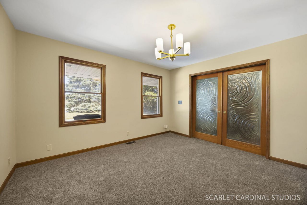 Welcome home to this charming Cape Cod nestled along a peaceful, tree-lined country road on over half an acre. A wide, covered front porch with a swing invites you to unwind and enjoy quiet mornings or relaxing evenings. Enter inside to a welcoming foyer with a spacious coat closet and newer hardwood laminate flooring that extends throughout much of the main level. The well-appointed kitchen offers abundant cabinetry and counter space, along with a breakfast bar and dedicated table area, perfect for everyday living and casual dining. A unique built-in cabinet with a hardwired ironing system adds both convenience and character. Glass doors lead directly to the backyard deck, making outdoor dining and entertaining effortless. At the heart of the home, the impressive great room features a vaulted ceiling, a striking stacked stone fireplace, and generous space for gathering. A second set of glass doors provides seamless indoor-outdoor flow. The formal dining room, highlighted by double pocket doors with decorative glass, offers flexibility as an elegant entertaining space or a private home office. The main level also includes a bedroom with a large closet, as well as a sought-after first-floor primary suite complete with a walk-in closet and en suite bath. A refreshed powder room and convenient laundry closet complete the first floor. Upstairs, you'll find two generously sized bedrooms, each with walk-in closets, along with a spacious full bath featuring a tandem room, ideal for a dressing area, makeup vanity space, or additional storage. Additional highlights include abundant storage throughout, a basement ready for your finishing touches, newer flooring in nearly every room, a spacious two-car garage, and well-maintained mechanicals and appliances. Located within the highly regarded Indian Creek School District #425. This inviting home is one you won't want to miss, schedule your showing today!