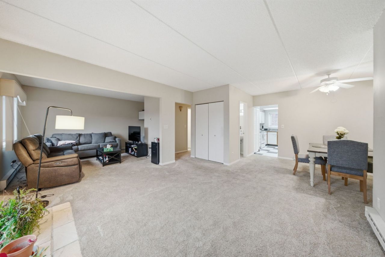 Enjoy sunrises and sunsets from this top floor, corner unit. Enter into the living area designed for entertaining with a sliding glass door to the balcony. The current owners uses the flex area as a living room space but it could be a den, home office or converted back into a second bedroom (with the plumbed wet bar space as a closet). The eat-in kitchen offers plenty of cabinetry and counter space plus access to a renovated back deck for easy grilling. The primary bedroom is light and bright and complete with wall to wall closet space. A full bathroom, powder room and laundry area complete this home. Additional storage is abundant and includes an additional closet in the living area, a utility closet and a secure storage space. Residents enjoy assigned parking, guest parking, easy access to expressways, shopping and dining. Park district and exercise facilities across the street!